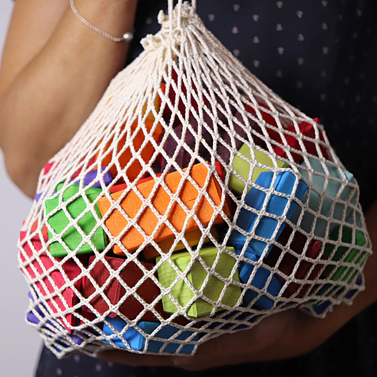 Durch die unregelmäßige Form dieser Bauklötze werden der Fantasie der Kinder keine Grenzen gesetzt und die Kreativität spielerisch gefördert. Ob als Auto, Schiff, Bügeleisen oder um eine Landschaft zu bauen, die Form der Hölzer läßt alles offen. Durch die weiche Oberfläche und ihre Größe gelingen schon den Kleinsten erste Stapelversuche. Und mit dem Baumwoll-Netz ist schnell alles aufgeräumt.
