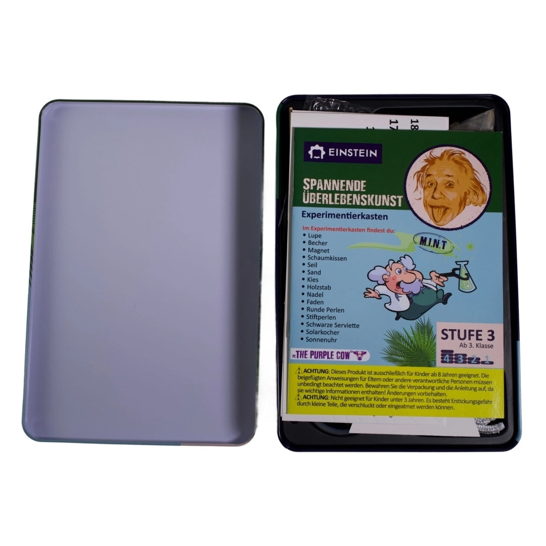Dieser Experimentierkasten vermittelt Kindern ab etwa 8 Jahren praktische Überlebensfähigkeiten durch hands-on Experimente. Junge Forscher erlernen essenzielle Techniken wie Wasseraufbereitung, Feuerentfachung ohne Hilfsmittel, Solarofenbau sowie die Herstellung von Sonnenuhr und Kompass. Zusätzlich werden Grundlagen der Morsezeichen-Kommunikation vermittelt. Mit über 10 verschiedenen Experimenten bietet der Kasten eine umfassende Einführung in Wildnis-Kompetenzen. Ideal für neugierige Kinder, die naturwissenschaftliche Prinzipien in realen Anwendungsszenarien entdecken möchten. Maße: 16,3 x 24,3 x 4,3 cm.